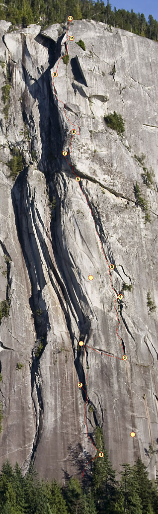 Freeway is a superb all free climb up the Dihedrals section of the Chief at Squamish. The climbing is sustained, but best characterized as technical rather than strenuous, with generally good protection. The route is described with the Express Lane finish since the superb exposed face climbing of this variation adds some extra variety and quality to an already great route.
