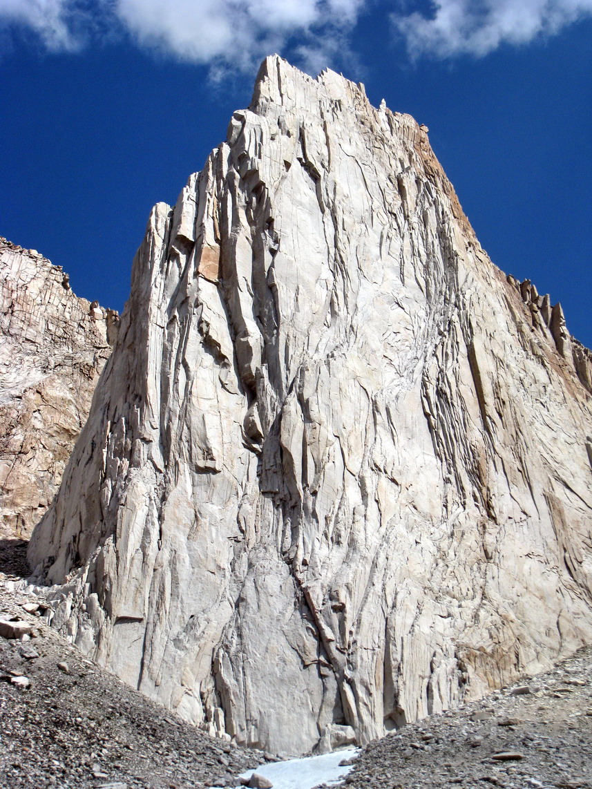 This route climbs a prominent huge corner to the left of the tall prow in the center of the face. There are several big corner systems here, but Sunspot is easily recognized by a large (60' x 40'), square patch of orange rock which forms the left side of the corner about half way up.